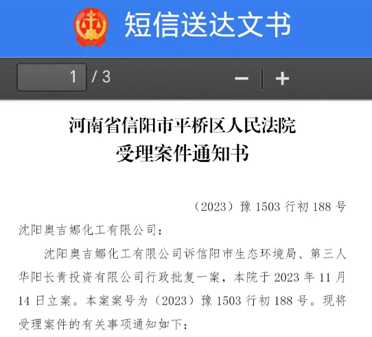 2023年11月14日, 沈陽奧吉娜化工有限公司收到《河南省信陽市平橋區人民法院受理案件通知書》【(2023)豫1503 行初188 號】。通知書顯示,被告是信陽市生態環境局,第三人是華陽長青投資有限公司。這應當是風電潤滑油央企招投標采購“民告官”第一案。