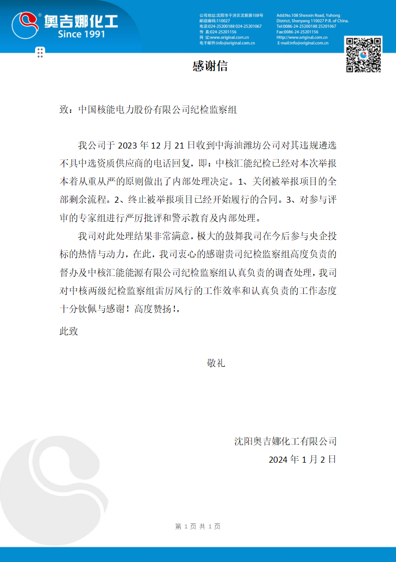 2024年1月2日,新年伊始第一個工作日,奧吉娜公司便懷著無比真誠、敬重的心情寄出了一封感謝信,感謝信是寫給中國核能電力股份有限公司紀檢監(jiān)察組的,奧吉娜為什么要寄出這封感謝信呢?