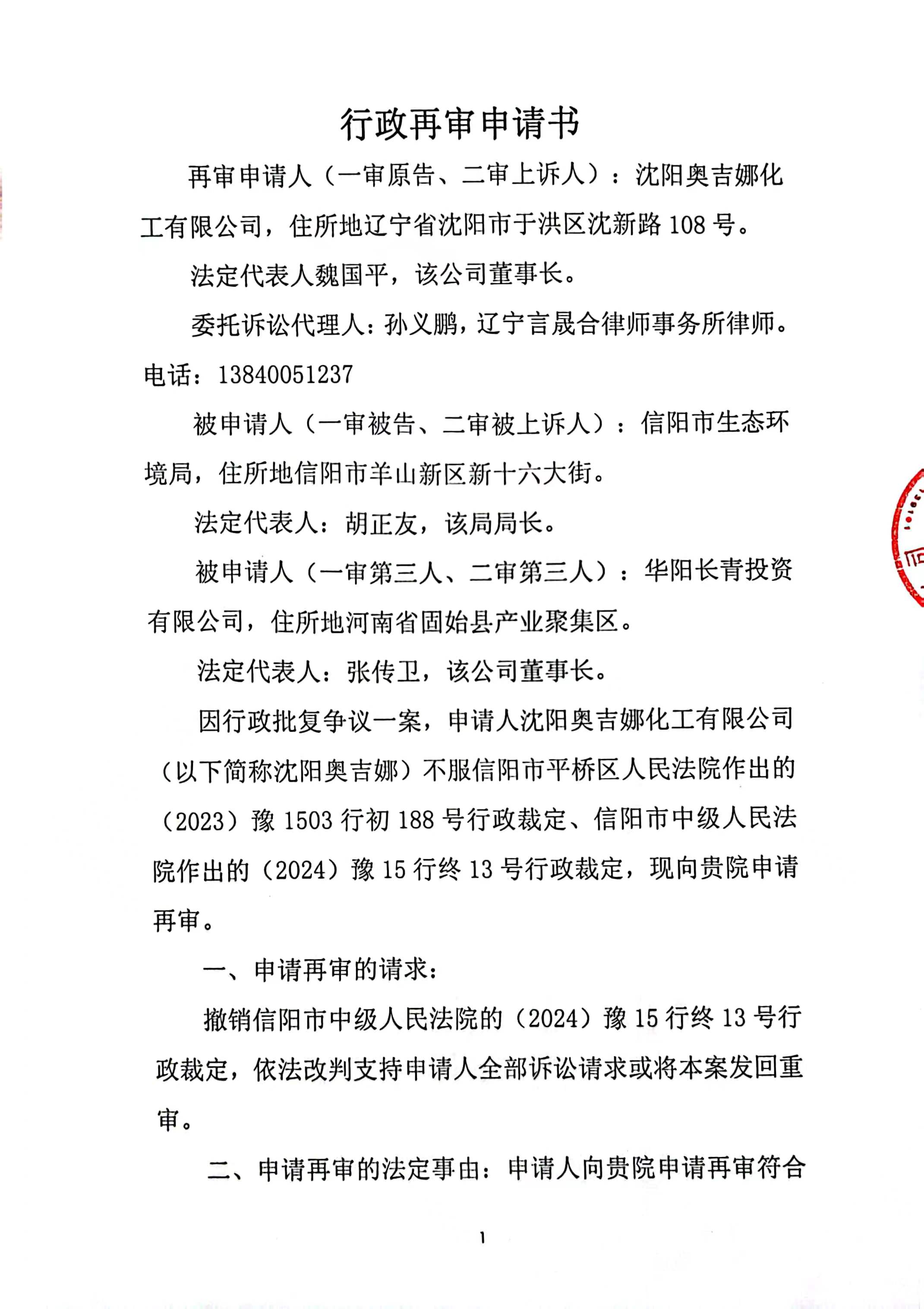 中國風電潤滑油民營企業沈陽奧吉娜化工有限公司(下簡稱:奧吉娜公司或上訴人)訴信陽市生態環境局(被上訴人)和第三人華陽長青投資有限公司(下簡稱:華陽長青公司)行政訴訟案,河南省信陽市中級人民法院于2024年4月2日作出二審行政裁定:駁回上訴,維護原裁定。