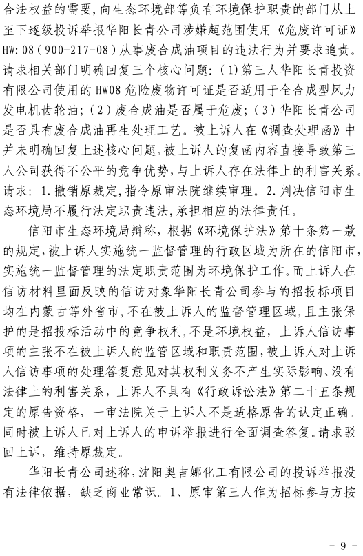 2、一審訴訟請求:請求人民法院判決撤銷被告作出的《信陽市生態環境局關于沈陽奧吉娜化工有限公司舉報華陽長青投資有限公司違法經營及固始分局不作為、亂作為等問題調查處理的函》;責令被告對原告向被告舉報華陽長青投資有限公司事項,限期進行重新調查和答復;判令被告認定的廢合成油不應按危險廢物有關規定進行管理違反法律規章規定,無效。