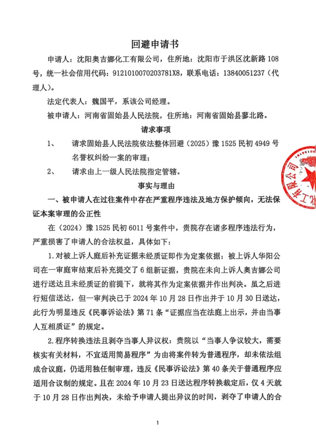 2、2024年6月16日,奧吉娜公司根據《中華人民共和國民事訴訟法》第二十二條的規定,向固始縣人民法院遞交《管轄權異議申請書》,請求法院依法將本案移送至被告奧吉娜公司所在地沈陽市于洪區人民法院審理。2024年6月26日,奧吉娜公司收到固始縣人民法院《河南省固始縣人民法院民事裁定書》(2024)豫1525民初6011號,裁定“駁回被告沈陽奧吉娜化工有限公司對本案管轄權提出的異議。”