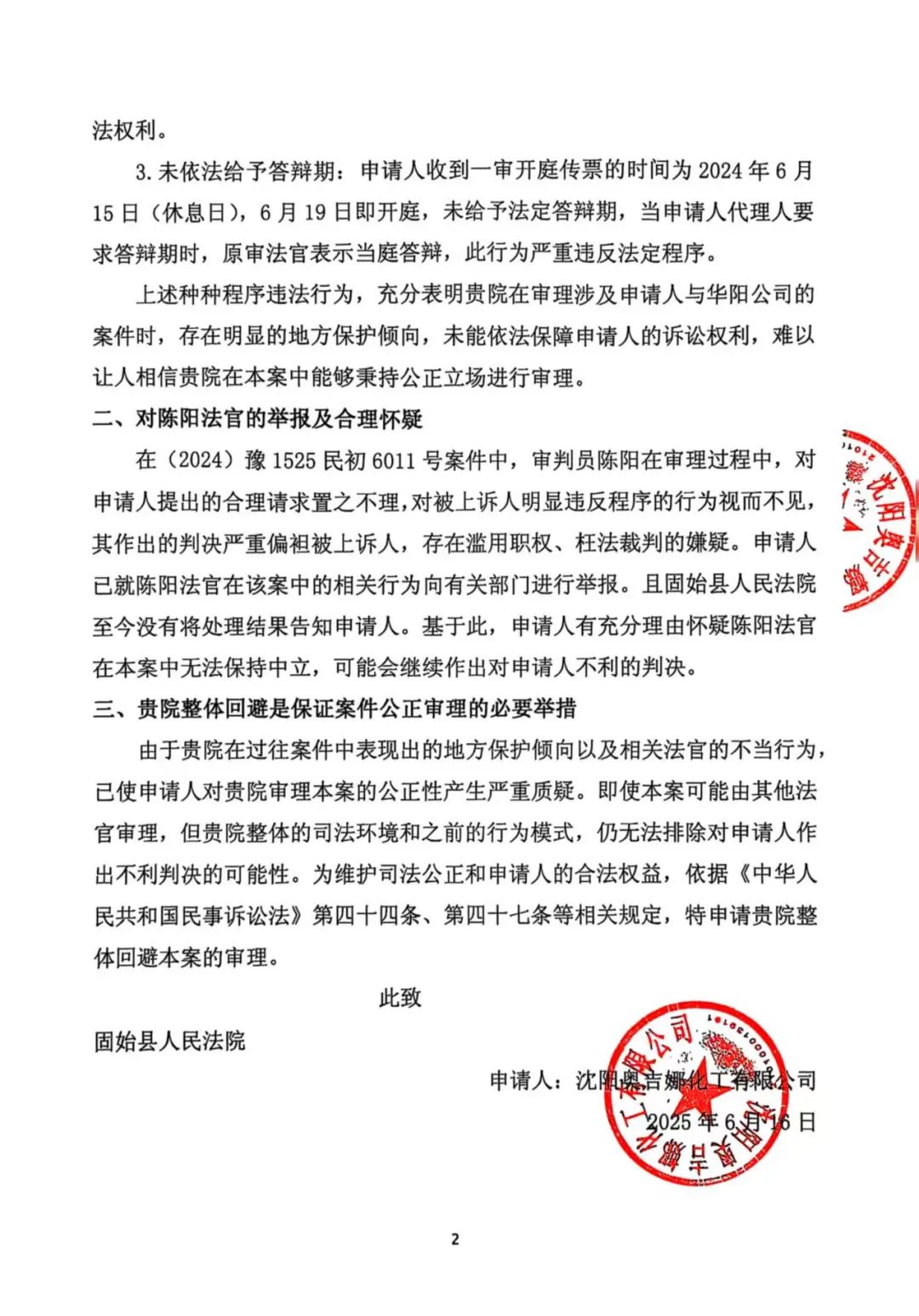 河南華陽長青起訴沈陽奧吉娜舉報案名譽侵權發回重審,奧吉娜基于原一審固始縣法院存在嚴重違法行為申請其全院回避!