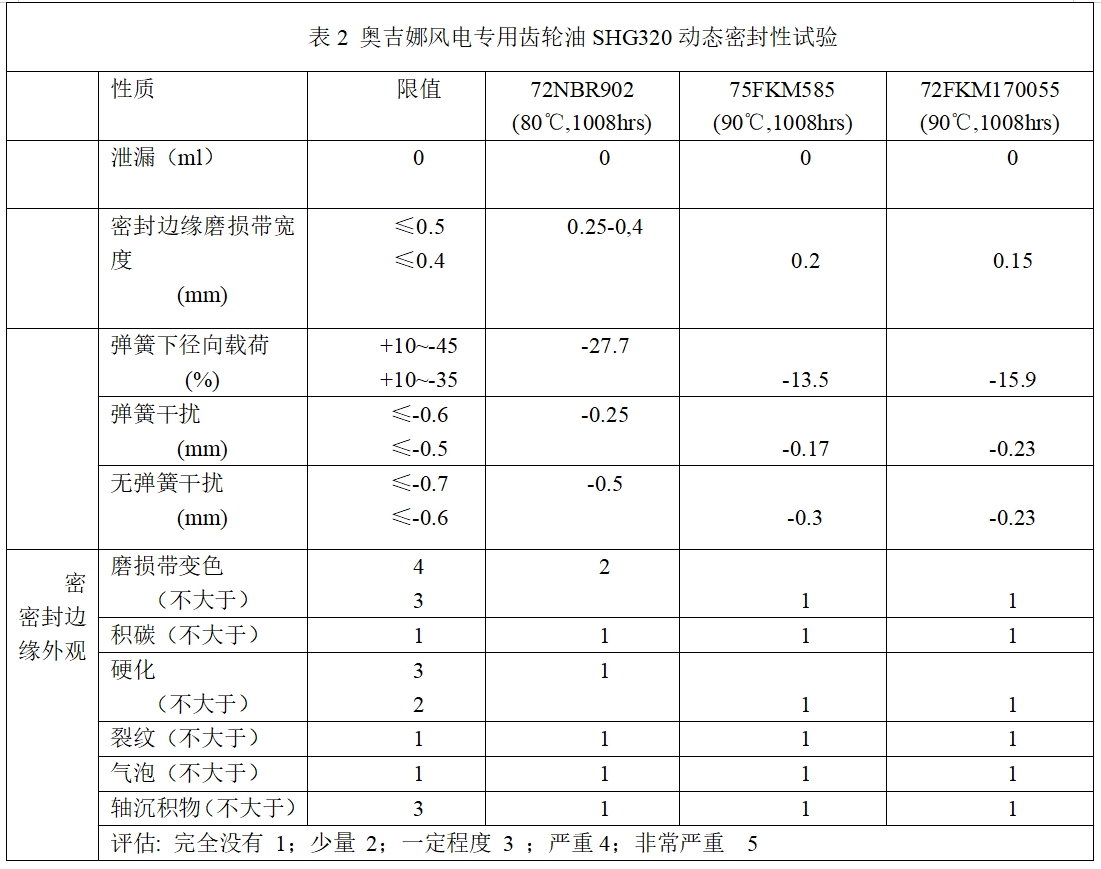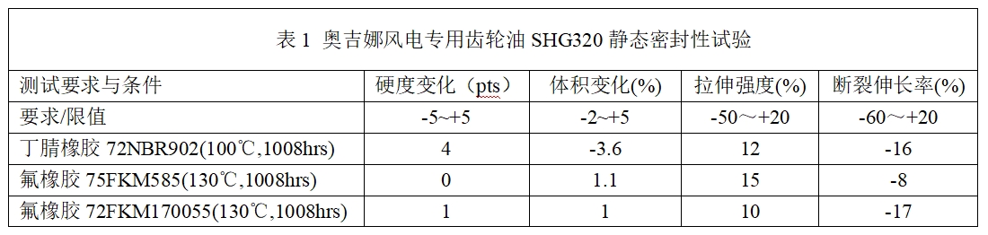 獲得弗蘭德認證的奧吉娜全合成風電專用齒輪油SHG320所通過的9項國際權威機構評定中,很重要的一項就是齒輪箱橡膠件的靜態及動態相容性試驗,評估結果如表1和表2所示: