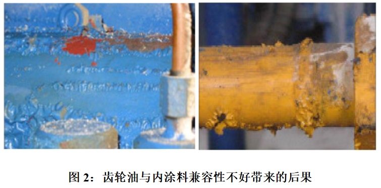 如果齒輪油和涂料兼容性不好,會(huì)導(dǎo)致內(nèi)涂料松弛堆積甚至懸浮于齒輪油中,從而無(wú)法起到防腐蝕的作用,堵塞過(guò)濾器,甚至?xí)s短換油周期。圖2為內(nèi)涂料與齒輪油兼容性不好的實(shí)例。